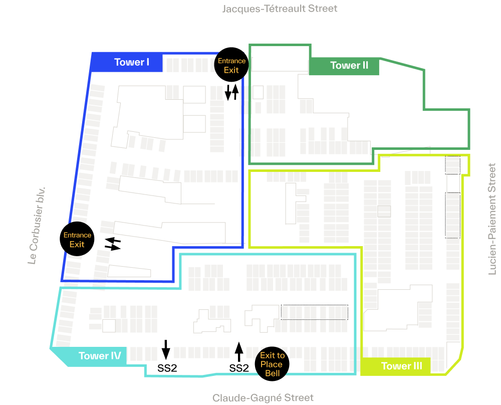 At the bottom of each of Espace Montmorency's four towers, you'll find an elevator that takes you up from level SS3 of the indoor parking garage to the first floor, via levels SS2 and SS1. Handy when you've got parcels to carry!